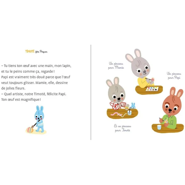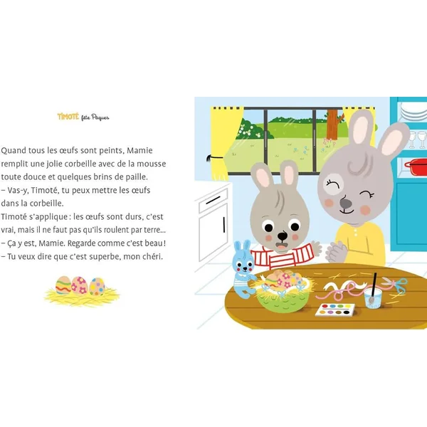 Timoté est un petit lapin qui, au fil des albums, partage sa vie avec ses copains et sa famille.A l’occasion des vacances de printemps, il est chez ses grands-parents et va préparer et fêter Pâques.Bien sûr, il faut décorer des œufs, faire une jolie table pour le déjeuner de Pâques, choisir un dessert et enfin chercher les œufs dans le jardin.Tous les rituels traditionnels sont là pour préparer en famille cette belle fête de Pâques.Nouveau : votre enfant peut désormais écouter gratuitement la version audio de l’histoire via l’application Lizzie en scannant le QR code à retrouver dans le livre !