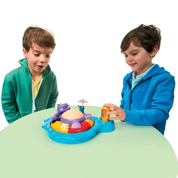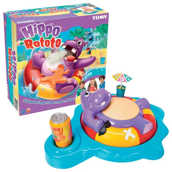 Hippo Rototo se prélasse sur sa bouée en sirotant une boisson pétillante. Plus il boit, plus son ventre grossi.Tourne le parasole pour savoir combien de fois tu devras appuyer sur la canette de soda pour faire grossir le ventre de Hippo Rototo. Mais attention, si il boit trop il pousse un gros rot et son ventre se dégonfle. Fous rires garantis ! De 2 à 4 joueurs.