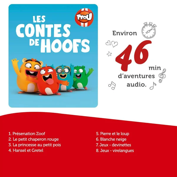 (Re)découvrez les intemporels contes de Blanche-Neige, Hansel et Gretel ou encore Pierre et le Loup… revisités par Les Hoofs, les mascottes de TFOU ! Avec Zoof en chef de file, vous n’allez pas vous ennuyer. Cette vraie pile électrique n’a pas une seconde à perdre pour conter les plus belles histoires… à sa façon !