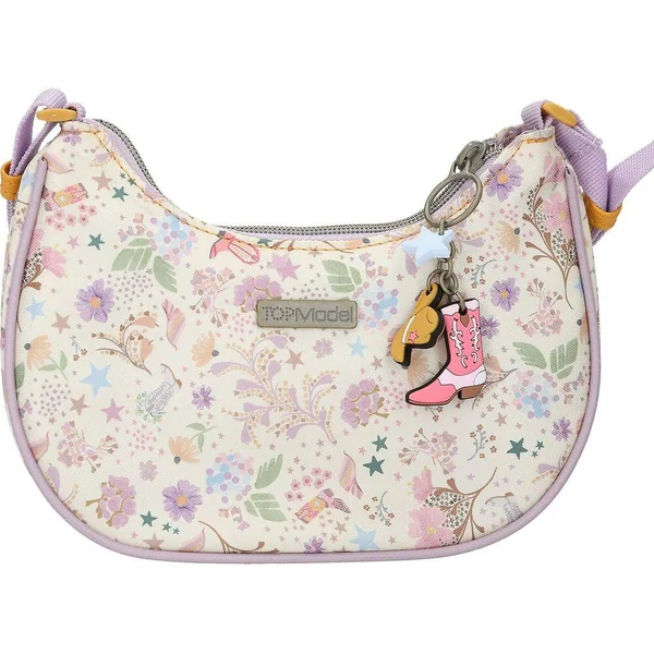 Cool comme une cow-girl : le devant de ce petit sac à main TOPModel en forme de demi-lune de couleur crème avec des détails lilas et jaunes présente un motif romantique de mannequin avec une guitare. Tout autour, il est orné d’un magnifique motif délicat composé de petites fleurs, feuilles, étoiles et bottes de cow-boy. Mignon petit plus : le pendentif accroché à la fermeture éclair avec un chapeau de cow-boy coloré, une botte de cow-boy et une étoile. L’anse est réglable en longueur. Matière principale : 100 % polyester