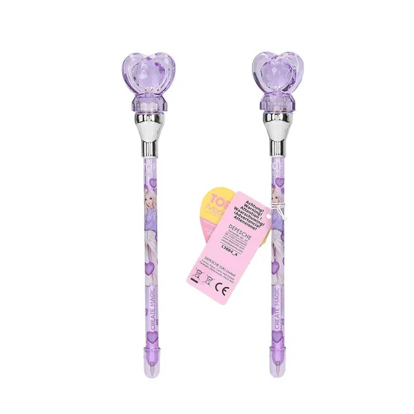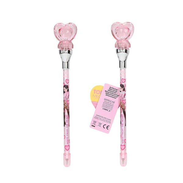 TOPModel Stylo à Bille avec Lumière Que la lumière soit ! Ces stylos à bille TOPModel sont munis d’adorables embouts en forme de coeur qui s’illuminent quand on appuie sur la mine (encre bleue) pour écrire. 3 versions : rose, violet et turquoise, tous avec de jolis imprimés mannequins et coeurs. Les piles et la mine fournies ne sont pas remplaçables.