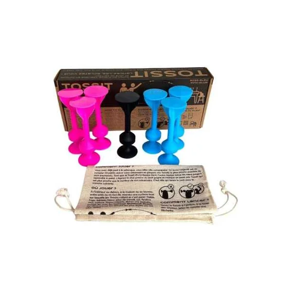Découvrez le jeu Tossit rose bleu, un jeu d’adresse et de lancer composé de fléchettes à ventouse, un mélange de pétanque, fléchettes, Molkky qui se joue à l’intérieur ou à l’extérieur, au sol ou à la verticale à partir de 3 ans.
