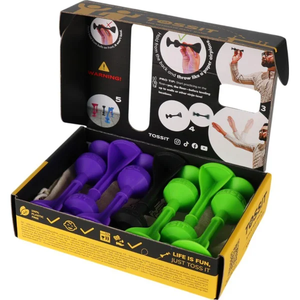 TOSSIT, c’est la pétanque comme vous ne l’avez jamais jouée ! Ce jeu d’adresse revisite les règles de la pétanque avec une touche moderne : des fléchettes en silicone qui collent aux surfaces lisses pour transformer n’importe quel endroit en terrain de jeu. ?? Jouez comme à la pétanque, mais sans limite de terrain ! Lancez vos fléchettes souples et tentez de vous rapprocher du Jack (fléchette noire), comme avec un cochonnet. Ajoutez du piment à la partie en empilant une fléchette sur une autre (+3 points), en touchant une fléchette adverse (+1 point) ou en dégageant un adversaire du jeu ! Le premier à 13 points gagne. ?? Pourquoi vous allez adorer ? ? Ultra-simple, ultra-fun – 10 secondes pour expliquer les règles, des heures de jeu pour s’amuser. ? Jouez partout – Au sol, sur un mur, une vitre, une table, en intérieur comme en extérieur. ? Laissez libre cours à votre créativité – Jouez en mode pétanque classique, duel, couleurs ou créez vos propres défis ! ? Durable et facile à nettoyer – 100% silicone alimentaire, lavable en machine ou sous l’eau, ultra-résistant. ? Facile à emporter – Glissez vos fléchettes dans une poche, un sac ou une valise et jouez où vous voulez. Avec TOSSIT, la pétanque s’invite partout, à tout moment, et devient accessible à tous. Attrapez vos fléchettes et défiez vos amis ! ?? 100% en silicone de qualité alimentaire (BPA free), le silicone est une matière inerte, ?? inoffensive pour l’environnement (à la différence du plastique).