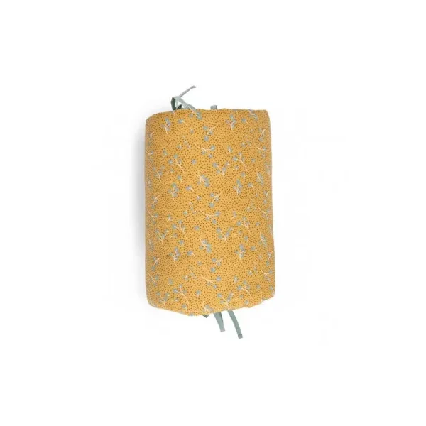 Ce tour de lit double épaisseur en lange imprimé ocre est moelleux et doublé de ouatine pour une bonne tenue. Il s’accroche facilement autour du lit de bébé grâce à ses jolis liens de couleur sauge. Un très beau cadeau de naissance utile et très confortable pour entourer bébé de douceur et décorer sa chambre.
