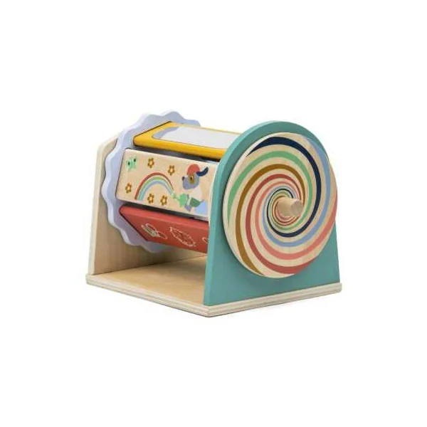 Ce jouet d’éveil en bois coloré invite les tout-petits à explorer un univers joyeux, pensé spécialement pour les mains curieuses et les regards émerveillés. À chaque pivot de la spirale, l’enfant découvre une nouvelle surprise : une couleur éclatante, une illustration amusante, son propre reflet grâce au miroir intégré ou encore une face animée de petites perles à observer et manipuler.