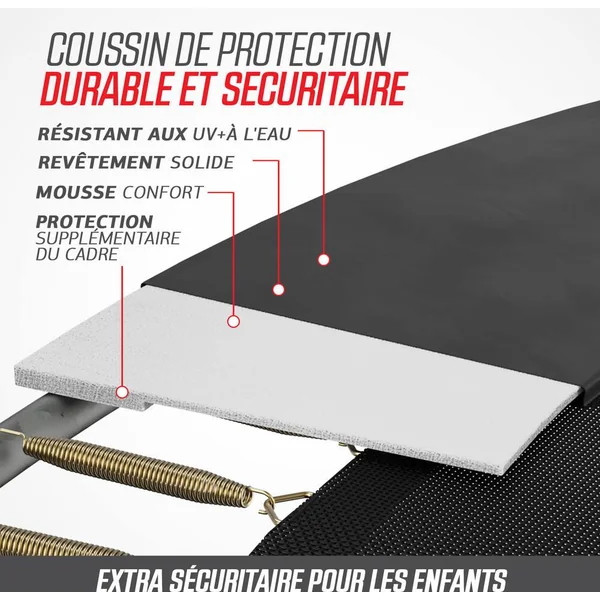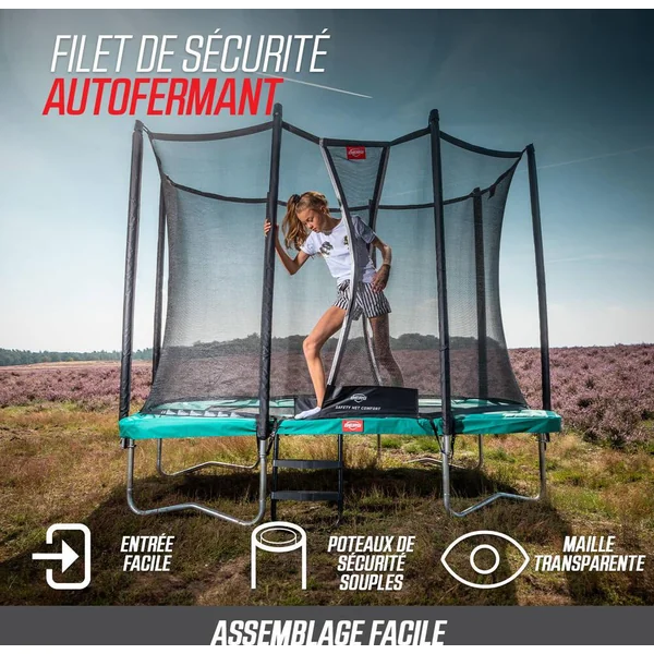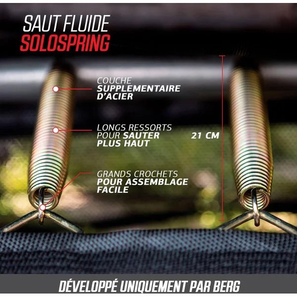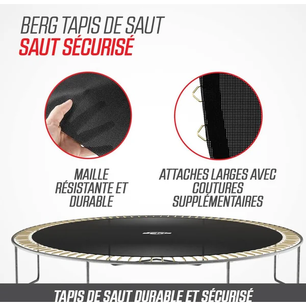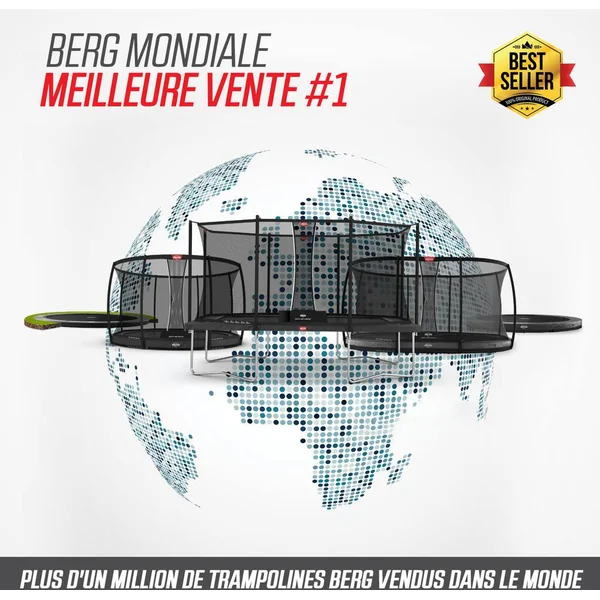 Tous ces sauts ne vous lassent jamais? Aucun problème! Le BERG Favorit vous procure des années de plaisir, s’use à peine et nécessite peu d’entretien. Le BERG Favorit a été conçu avec beaucoup de soin et d’attention. Le résultat en vaut la peine; c’est un trampoline d’excellente qualité et très sûr.Toile de saut. Tapis de saut durable en propylène tissé très résistant. Les boucles de ces robustes trous métalliques des ressorts sont solidement fixées avec 8 séries de coutures. Grâce à la structure à mailles ouverte, le tapis de saut ne se réchauffe pas et ne brûle pas les pieds.Goldspring Solo Les trampolines de toutes les tailles de la ligne Favorit sont équipés de ces ressorts. C’est pourquoi on rebondit si confortablement sur ces trampolines. Le confort de saut sur ces trampolines est beaucoup plus élevé que sur la précédente ligne de BERG Talent avec ressorts GoldSpring Talent.BERG RegularSi vous ne voulez pas creuser de trou dans le jardin, il est préférable de choisir un trampoline haut. Un trampoline haut est très facile à installer et à changer de place. En outre, un trampoline haut se voit bien dans le jardin.Un trampoline rondLe cadre d’un trampoline rond est très solide. Quand on rebondit sur un trampoline rond, on revient toujours vers le milieu. C’est au milieu d’un trampoline rond que l’on rebondit le plus agréablement. La raison en est la suivante: c’est au milieu que les ressorts et le cadre répartissent mieux les forces du saut.