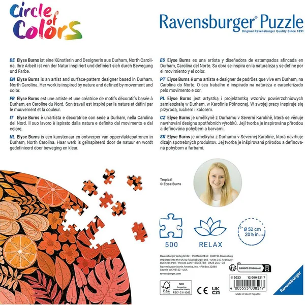 Découvrez cette nouvelle collection de puzzles au format rond inédit et aux illustrations fraîches et tendances idéale pour un moment de pure détente dans un tourbillon de couleurs ! Toujours avec la même qualité Ravensburger ! Les puzzles Circle of Colors sont concus par des artistes et offrent un tout nouveau défi, celui d’assembler des puzzles au format circulaire. Pour les débutants en matière de puzzles, les professionnels expérimentés ou tout simplement pour s’évader du quotidien stressant, chacun trouvera SON Circle of Colors. Les couleurs, qui sont disposées en suivant les couleurs de l’arc-en-ciel, facilitent l’assemblage du puzzle. Vous obtiendrez ainsi le motif fini, pièce par pièce, nuance de couleur après nuance de couleur.