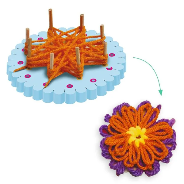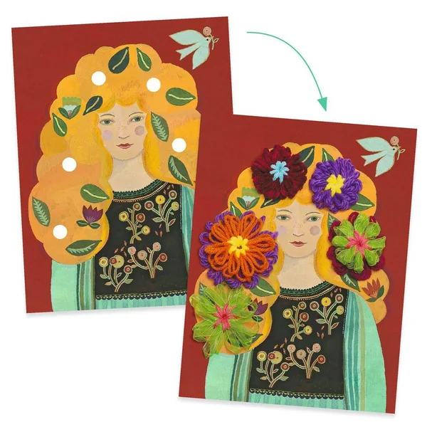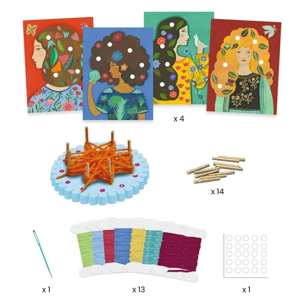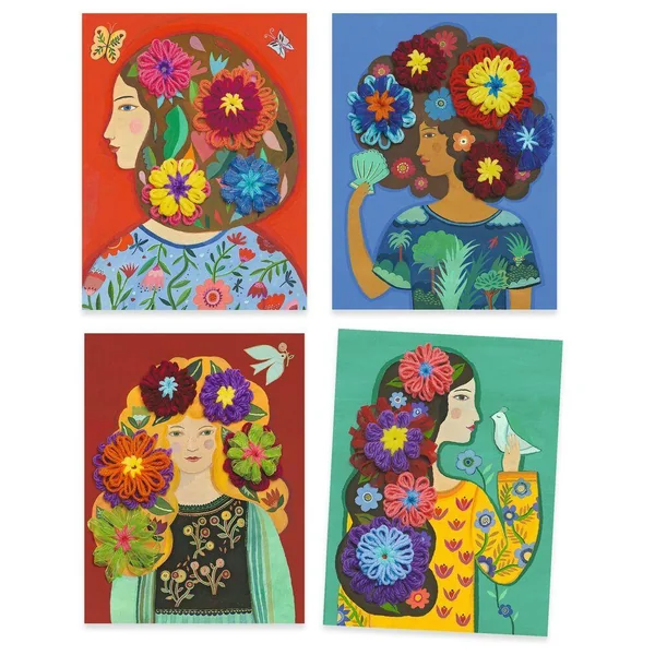 Un outil sur mesure permet de façonner des fleurs en rubans, laine ou organza. Les fleurs sont ensuite collées sur 4 tableaux pour créer des portraits plein de douceur et de poésie.