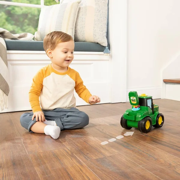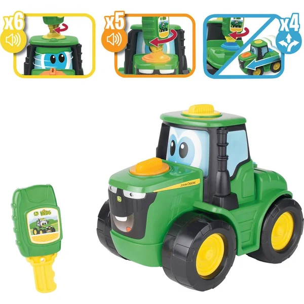 Grâce à sa clé interactive, votre enfant pourra insérer la clé à différents endroits pour voir réagir son tracteur Johnny ! Le trou de serrure orange sur le capot possède 6 sons de moteur uniques et des lumières. Le trou de serrure rouge sur le toit de la cabine a 3 expressions des yeux, chacune avec des sons et des lumières uniques. Et enfin, le trou de serrure bleu sur la partie arrière permet à Johnny de conduire en ligne droite et de réaliser 3 autres figures uniques. Chaque modèle de conduite a également des lumières et des sons.