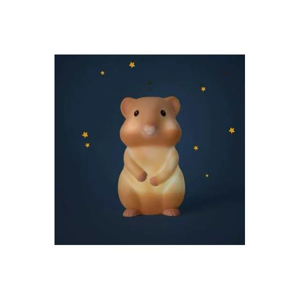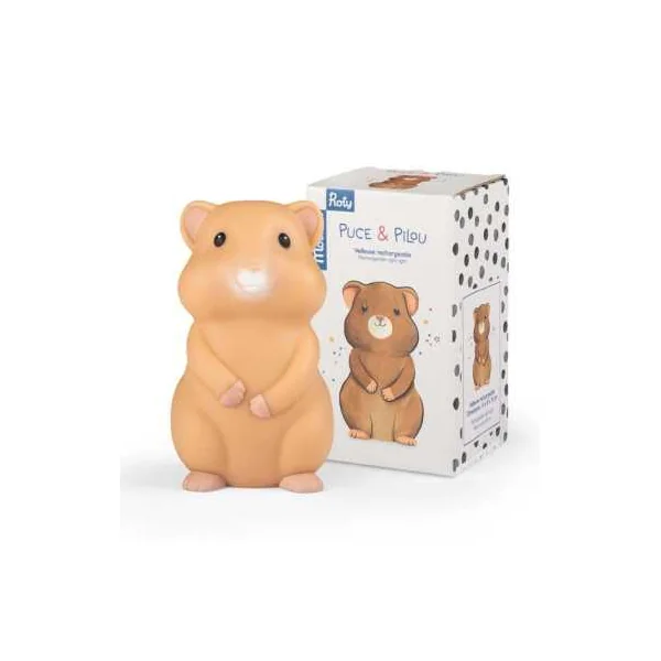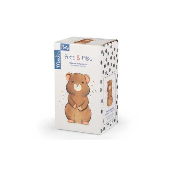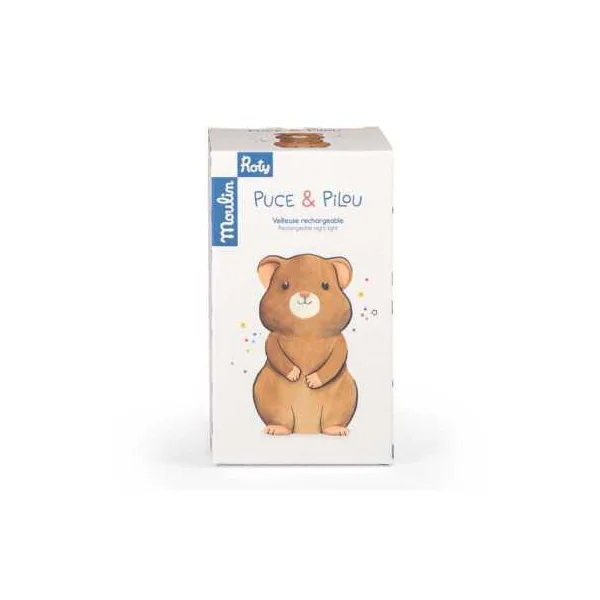 Découvrez la veilleuse hamster de la collection Puce & Pilou de Moulin Roty, une douce veilleuse pour décorer la chambre et apaiser les nuits de bébé en diffusant une douce lumière.