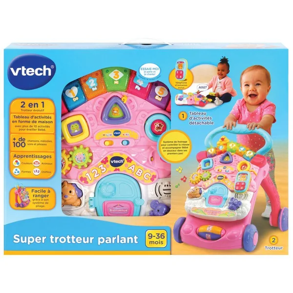 Le super trotteur parlant 2 en 1 de la marque VTech est le jouet d’éveil idéal pour tous les bébés en pleine découverte et croissance.