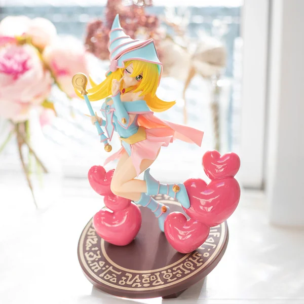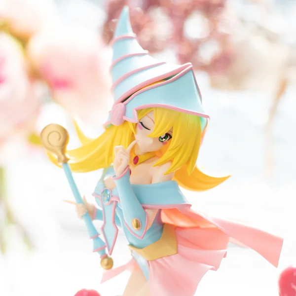La figurine insiste sur ce contraste qui fait sa signature : une silhouette de mage élégante, presque “mignonne” à première vue, mais codée comme une combattante. Le bleu profond de la tenue et du chapeau structure l’ensemble, pendant que les touches roses — cape, liserés, volumes autour du socle — viennent adoucir l’image… juste assez pour tromper. Les bottes hautes et les petits détails dorés (boucles, ornements) ajoutent un côté “tenue de scène”, comme un costume d’apparat destiné à être vu au moment de l’invocation.