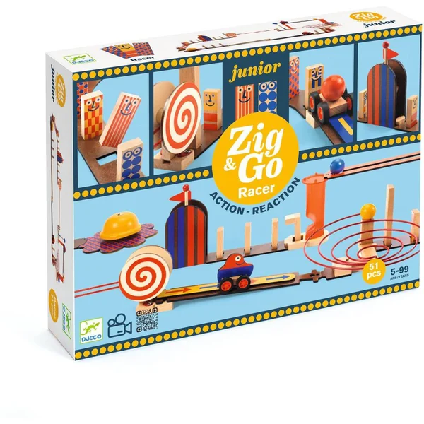 Racer est un jeu de réaction en chaîne, de réflexion et de construction en bois pour les enfants à partir de 5 ans. L’enfant suit les 3 modèles du livret pour construire son parcours ou en imagine d’autres à l’infini. Un contenu époustouflant avec de drôles de dominos Zig qui représentent des bonhommes. Ce jeu est compatible avec tous les coffrets de la collection pour inventer des parcours action-réaction encore plus ingénieux !